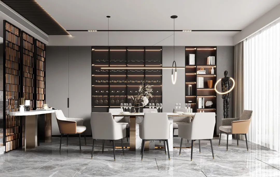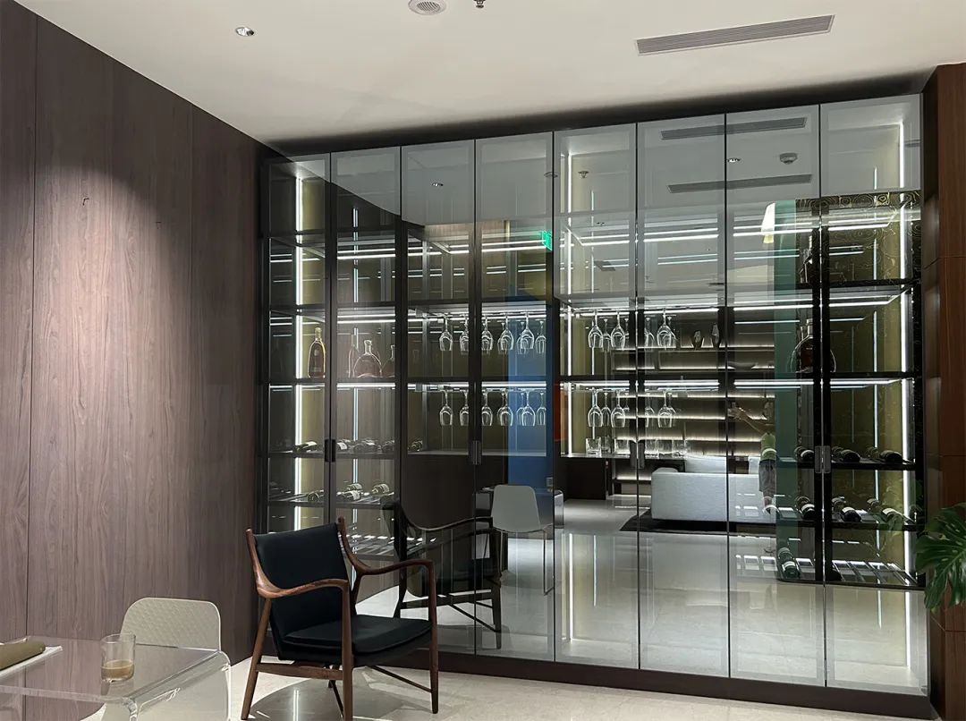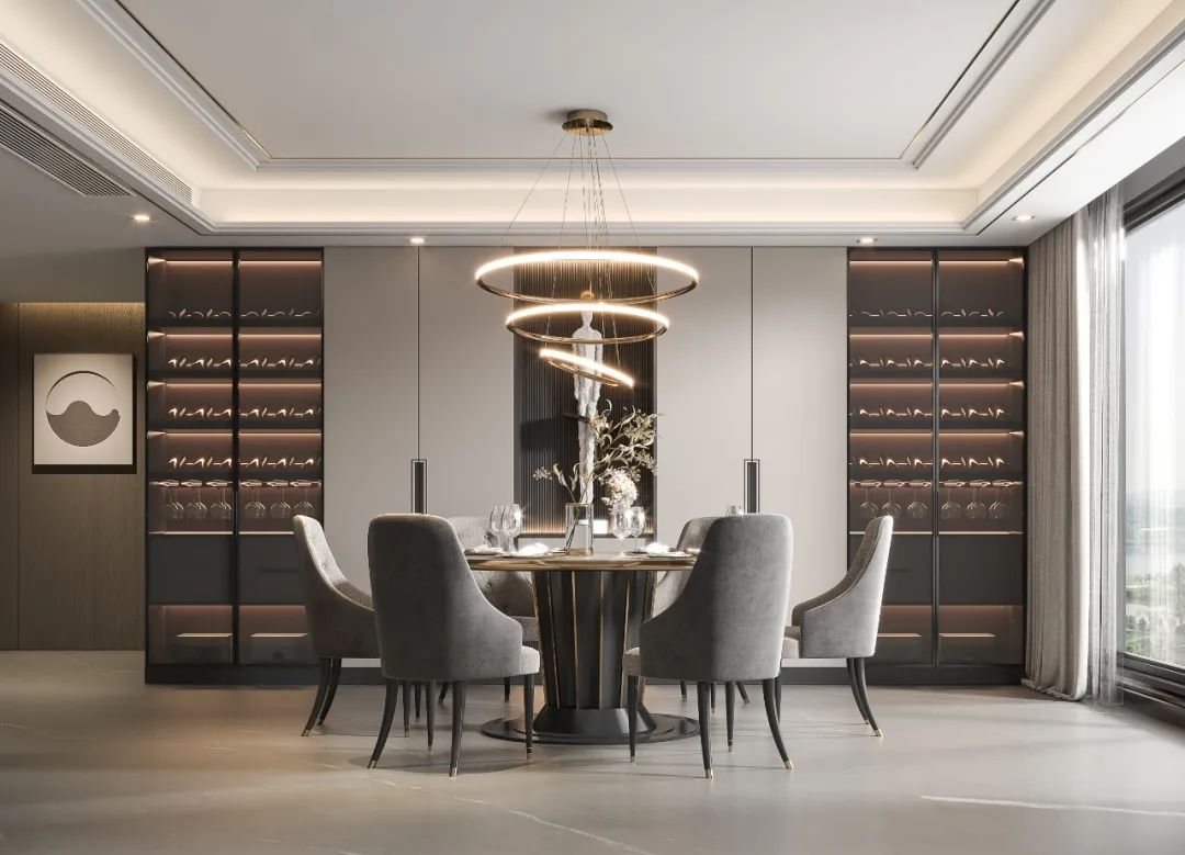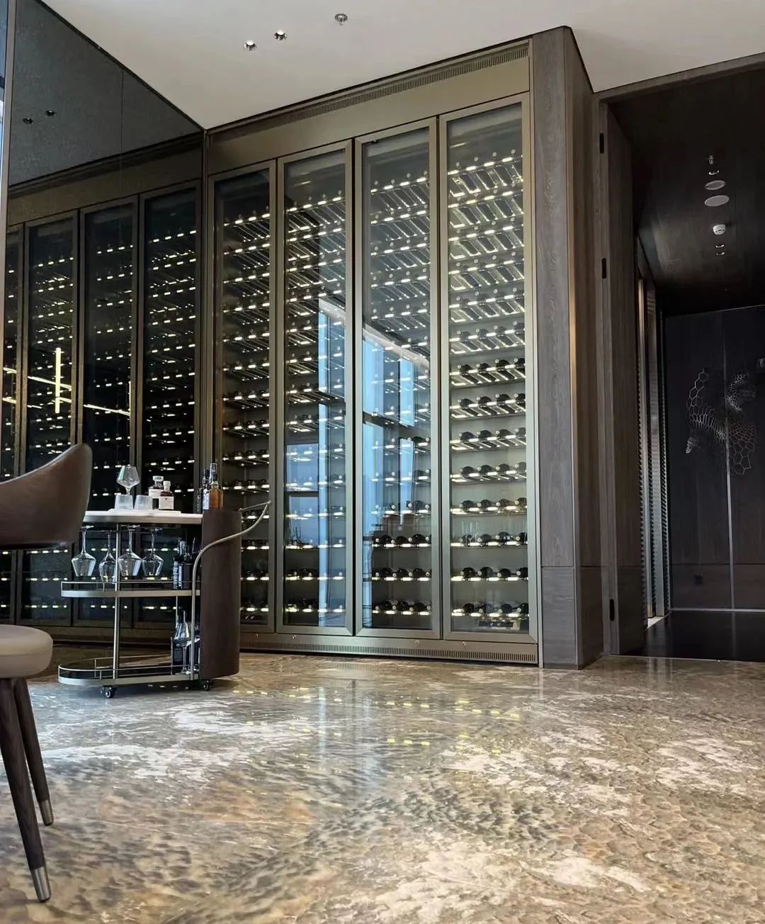 情緒上來的時(shí)候,唯有酒最懂我;在原木護牆的基礎上,延伸出一組簡雅的玻璃酒櫃,金屬框與玻璃門的組合形成(chéng)通透、輕奢的視感氛圍。
