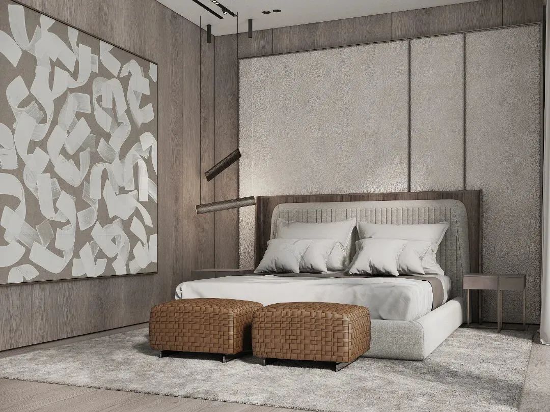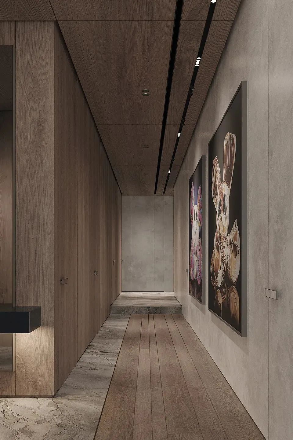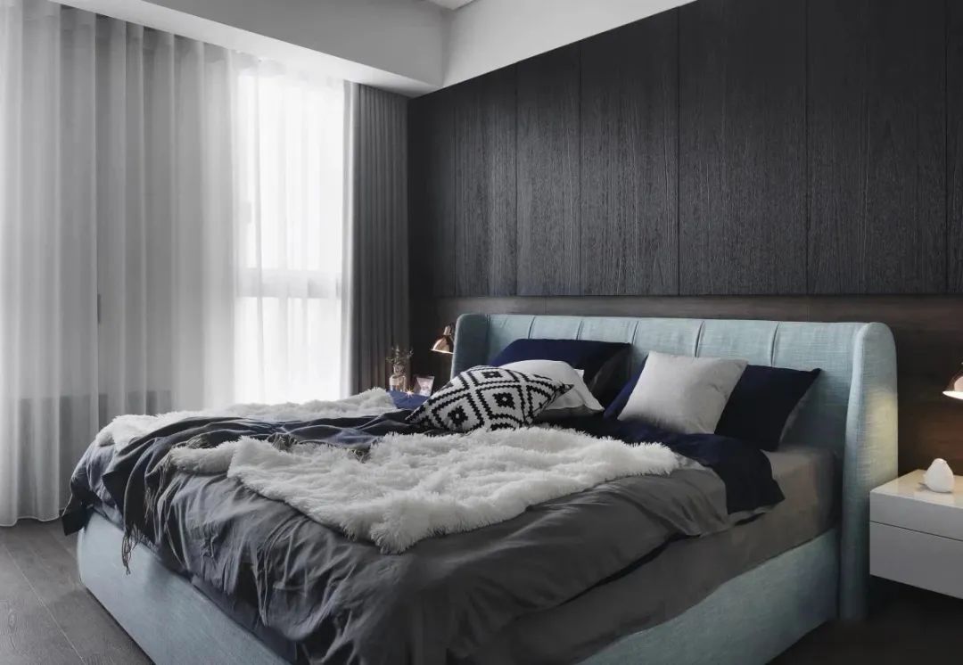 進(jìn)入卧室,橡木材質的牆闆、留白的意境在空間呈現中自成(chéng)一派,個性中帶點高級感,通過(guò)明暗關系的變化,達到(dào)空間平衡感。