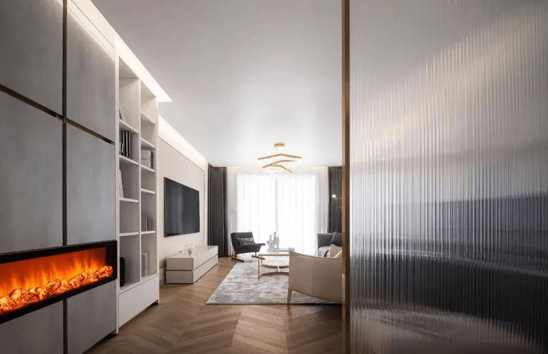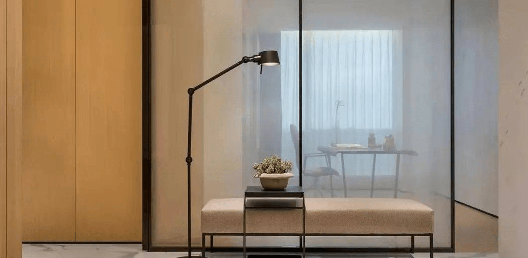 精緻而有質感的書房,隐藏著(zhe)詩意的鋒芒;不規則的玻璃屏風成(chéng)了客廳與書房的連接點,弱化了空間的距離,也保持了書房的獨立性。