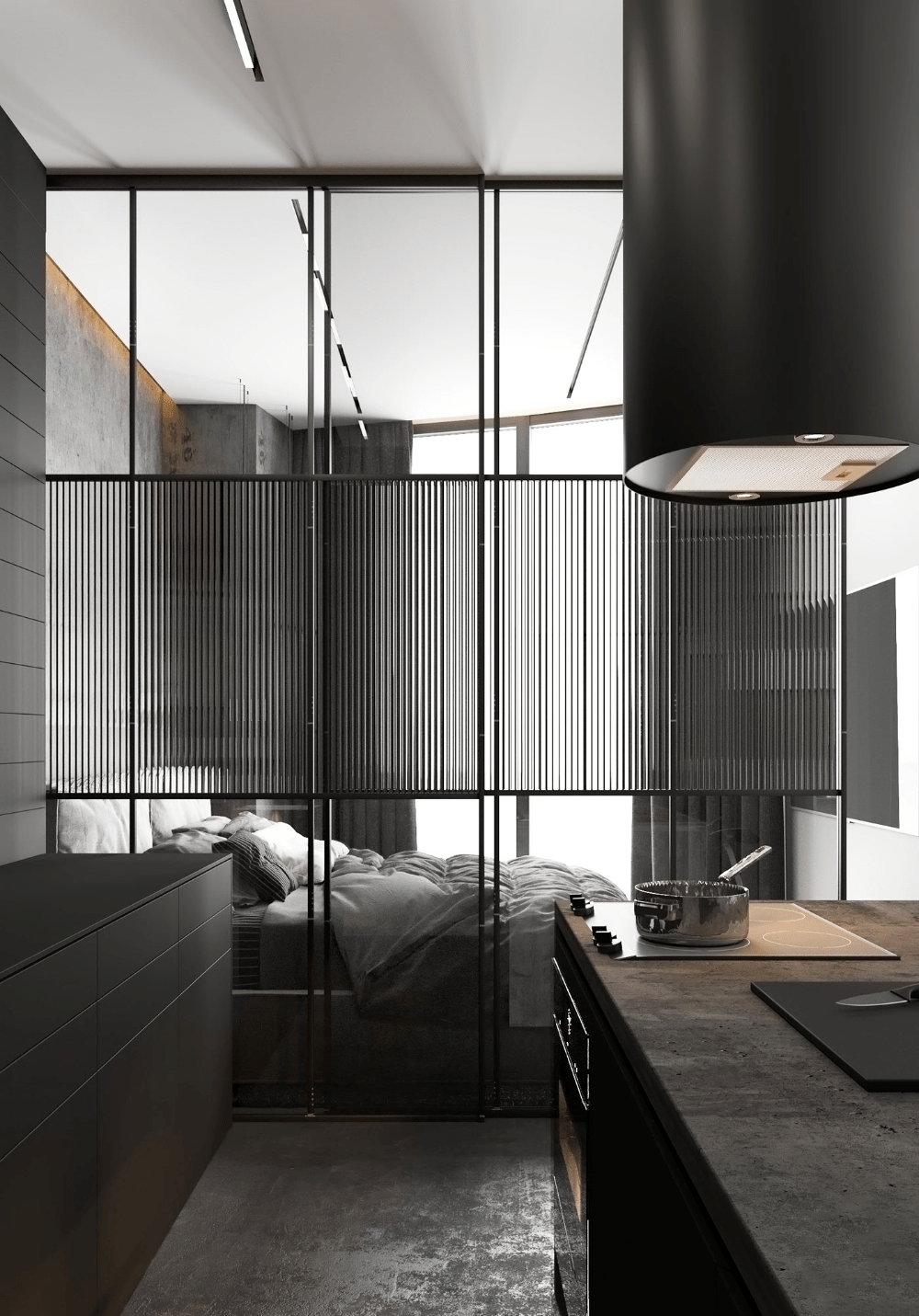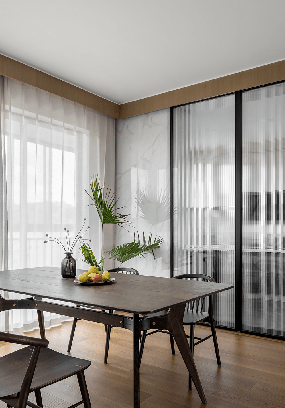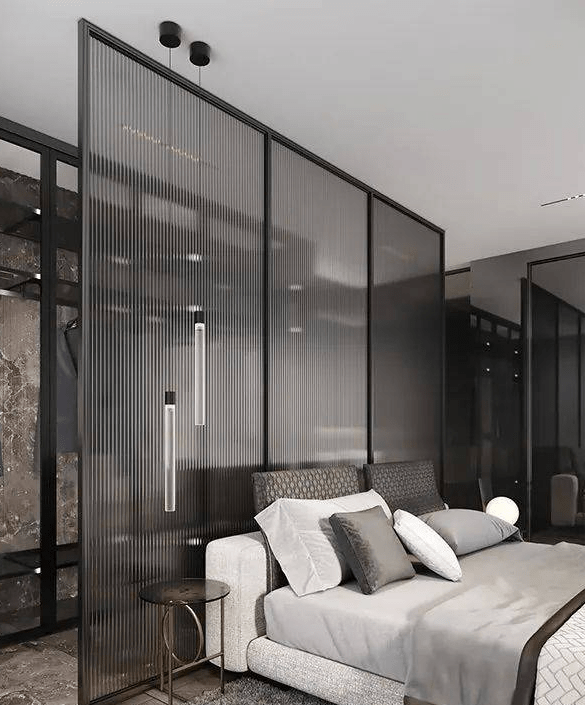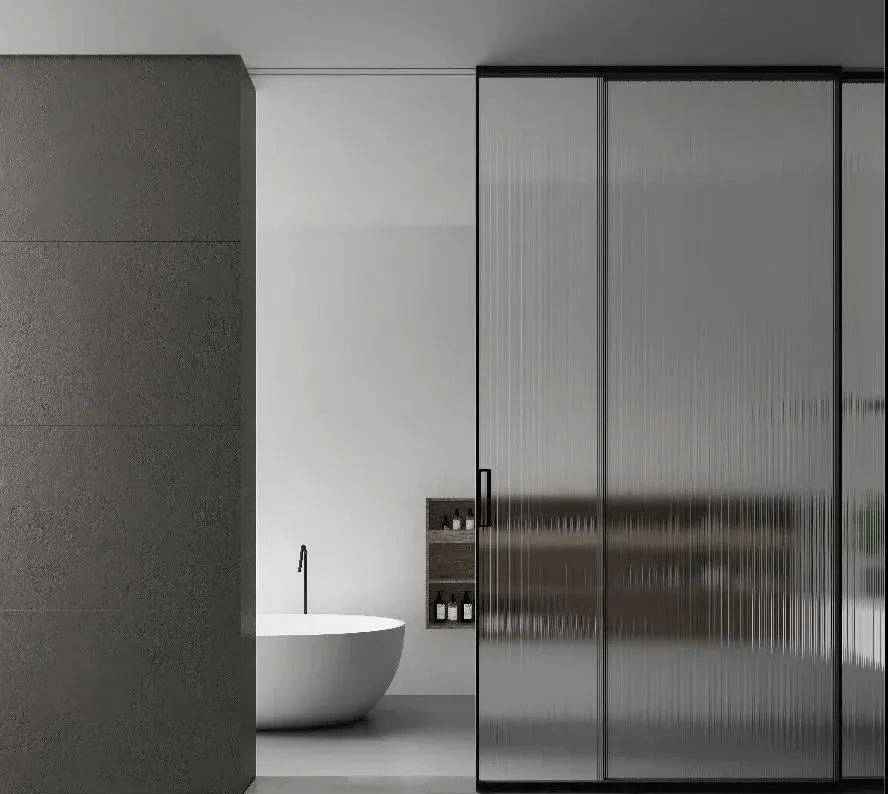 黑色邊框的落地玻璃門集顔值與功用于一身,遠遠眺望灰色的波紋微微泛著(zhe)光澤的質感,不著(zhe)聲息間中映射出家的輪廓。