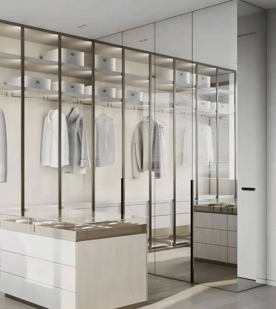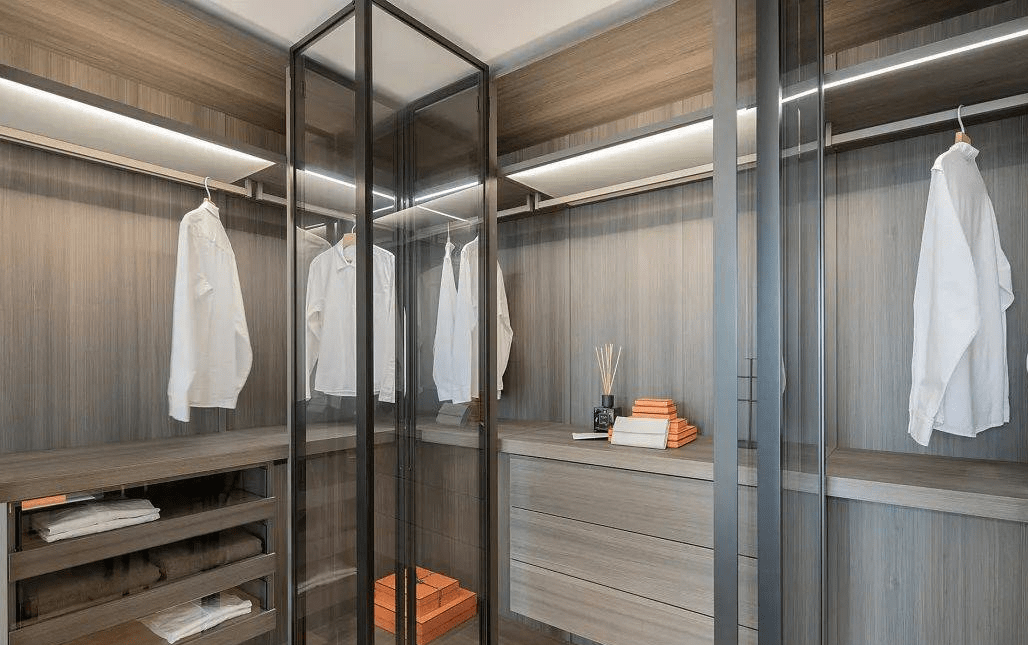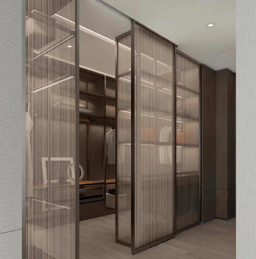 以玻璃為櫃門,將(jiāng)藝術與光影互相滲透,透明的材質貫穿于空間的主線之中,消減了空間的隔閡,予人于輕盈而靈動的觀感。