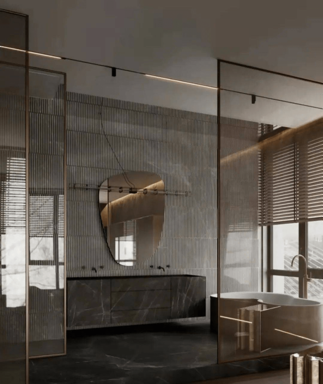 光與影的介入,是對(duì)空間的一次重塑;浴室空間引入自然元素于設計的理論之中,組成(chéng)具有力量的美感;落地的玻璃移門,好(hǎo)似承載著(zhe)整個空間的藝術裝置。