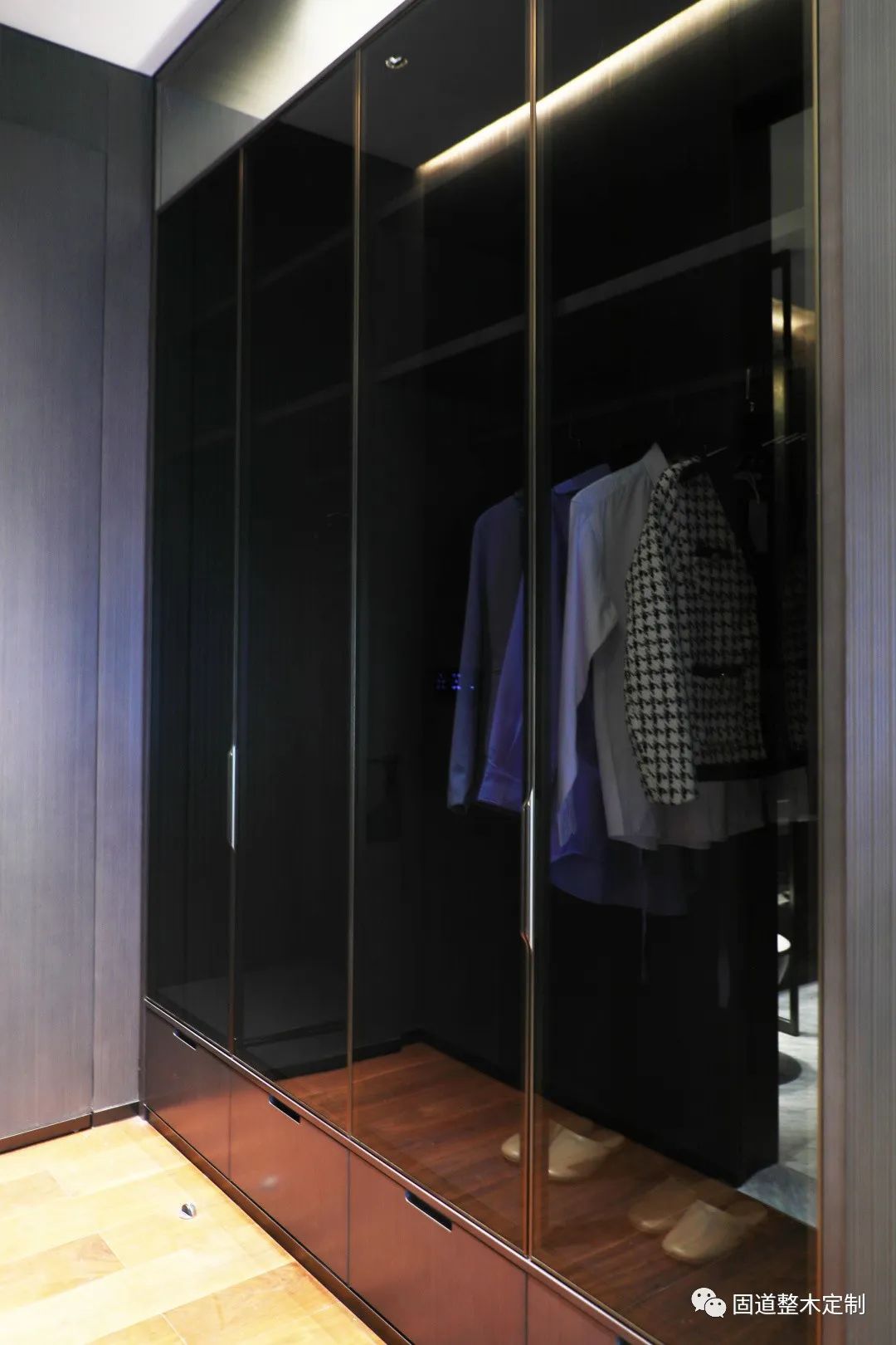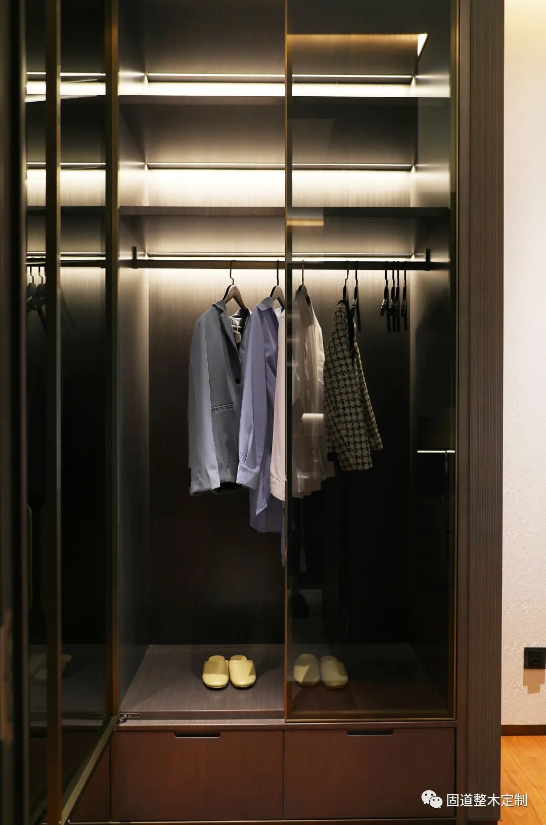 主卧衣帽間純粹優雅,以鏡面(miàn)為元素,在金屬與木質之間,放大了空間的尺度,井然有序間的收納功能(néng),讓選擇和搭配變得更加從容。